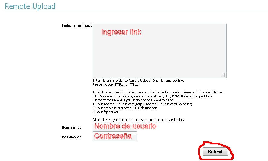 si subimos un link directo, osea, un http directo, ya sea de un leech o de un server que no sea con usuario lo ponemos en el recuadro pero no ponemos ni nombre de usuario, ni pass.